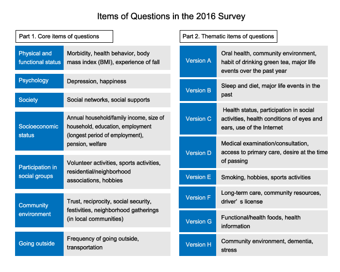 A questionnaire booklet consists of 16 pages. Each booklet has two parts: Part 1 “Core items of questions” (10 pages) and Part 2 “Thematic items of questions” (2 pages). The former part is designed for all research subjects and comprises various questions about relevant factors of preventive care and important adjustment factors, while the latter has eight different thematic topics of questions (Versions A-H), and it is intended to be used for analytical purposes. Each research subject receives, at random, one of these eight questionnaire booklets. Eight versions of booklets are assigned and distributed evenly to research subjects in each survey district.