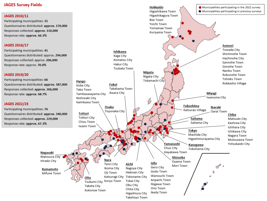 The Japan Gerontological Evaluation Study (JAGES) is a research project that aims to build a scientific foundation for preventive policies toward achieving a society of healthy longevity. In the 2022 survey, JAGES collaborated with 76 municipalities across 23 prefectures nationwide and conducted a survey of older adults who were not certified as requiring long-term care. Approximately 230,000 older adults responded to the survey (including those conducted in fiscal year 2023).