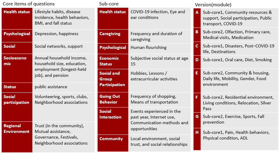 Survey items (in the 2022 survey) Each participant received one randomly assigned version of a 16-page questionnaire booklet, selected from eight versions (modules) labeled A–H. For research analyses, we used (i) eight pages of “core items” answered by all respondents, including factors related to long-term care prevention and key confounders; (ii) two pages of “sub-core” items important for community diagnosis; and (iii) two pages of “version-specific items,” in which eight exploratory modules were evenly allocated across versions.